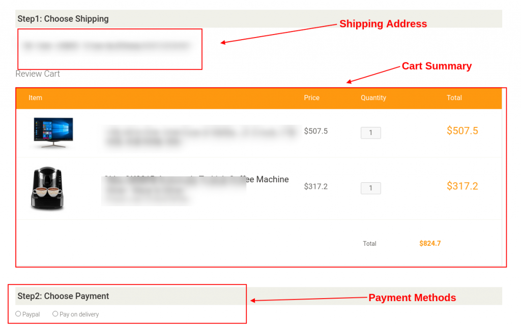 You might remember when when have worked on the cart the last thing is displaying the cart items, and lift with a checkout button at the bottom of the page, usually when the user clicks on that button it will be redirected to a checkout screen where he can select a shipping address and payment method, this screen similar to the screen in the below figure: