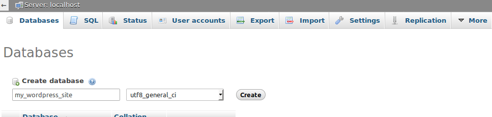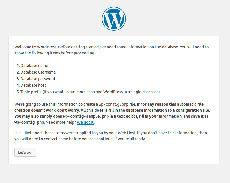 Click on the “Let’s go” button and you will see the next page that requests the database details so let’s create them first on phpmyadmin.