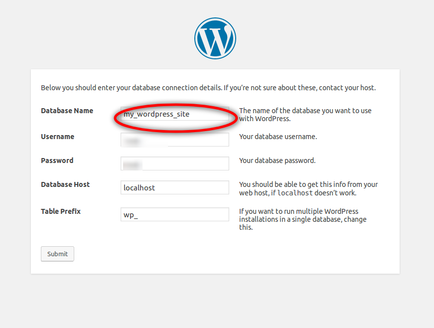 Return to the wordpress installation and fill in the database details and click on submit button to continue.