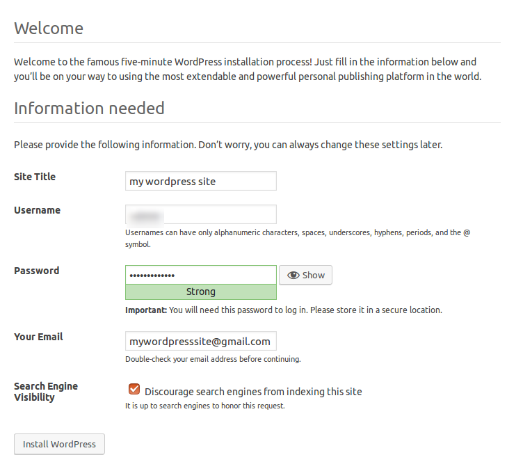 For this part of the series we will install and prepare wordpress as wordpress is well-known for its ease of installation and it has a nice install wizard to simplifies the install process.