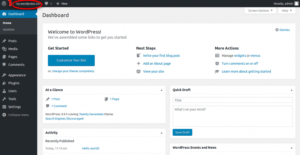 Then in your web browser go to http://localhost/my-wordpress-site you will see the getting started screen.
