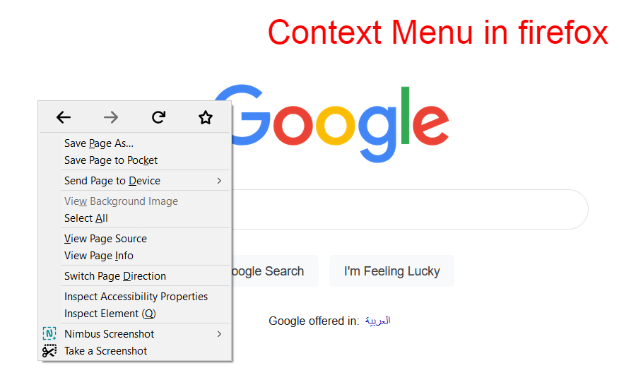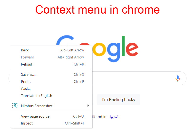 Usually web browsers use context menus to achieve specific tasks like DOM inspection, view page source, reloading. You can already see this in firefox or chrome, for example in firefox there are actions such as “Save Page As“, “Inspect Element (Q)“, etc. also in chrome the context menu shows actions such as “Back“, “Reload“, “Print” as shown in this figure: